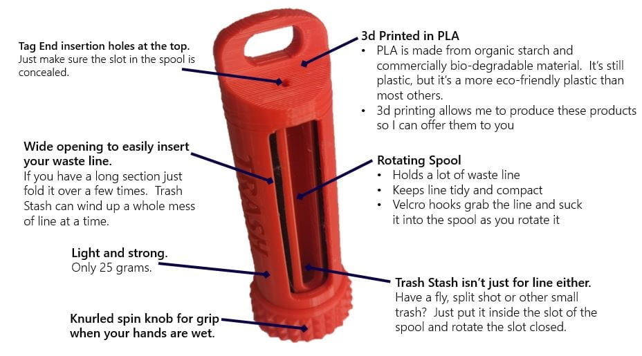 Trash Stash ist ein praktisches kleines Werkzeug, um Ihre gesamte Abfallschnur beim Angeln aufbzuewahren. Sie können es mit nach Hause nehmen und die Schnurabfälle schnell und einfach entsorgen. Auch wenn Sie mal vergessen, es zwischen den Angelausflügen zu leeren, machen Sie sich keine Sorgen, der Trash Stash kann viel aufnehmen!